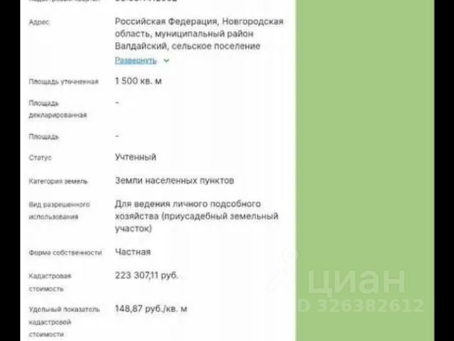 Новгородская область, р-н Крестецкий, с/п Новорахинское, д Давыдовщина: земельный участок 25 соток Категория земель: Земли населённых пунктов Разрешенное использование: Для ведения личного подсобного хозяйства Кадастровый номер: 53:06:0091701:99 До озера Радоль 420 м, до озера Ламерское 250 м. 350 тыс.руб.