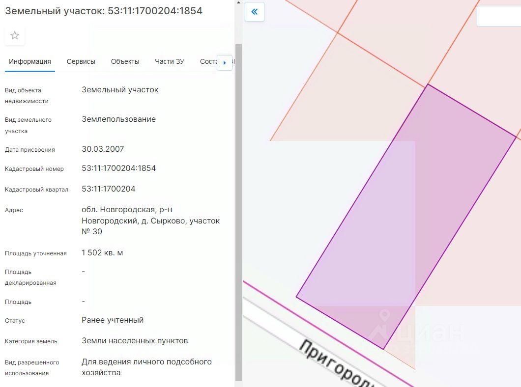 Лот 1 земельный участок из земель населённых пунктов с кадастровым номером 53:11:1700204:1854, площадью 1502 кв.м, расположенный по адресу: Новгородский р-н, д. Сырково, участок 30, разрешенное использование: для ведения личного подсобного хозяйства, аренда сроком на 20 лет