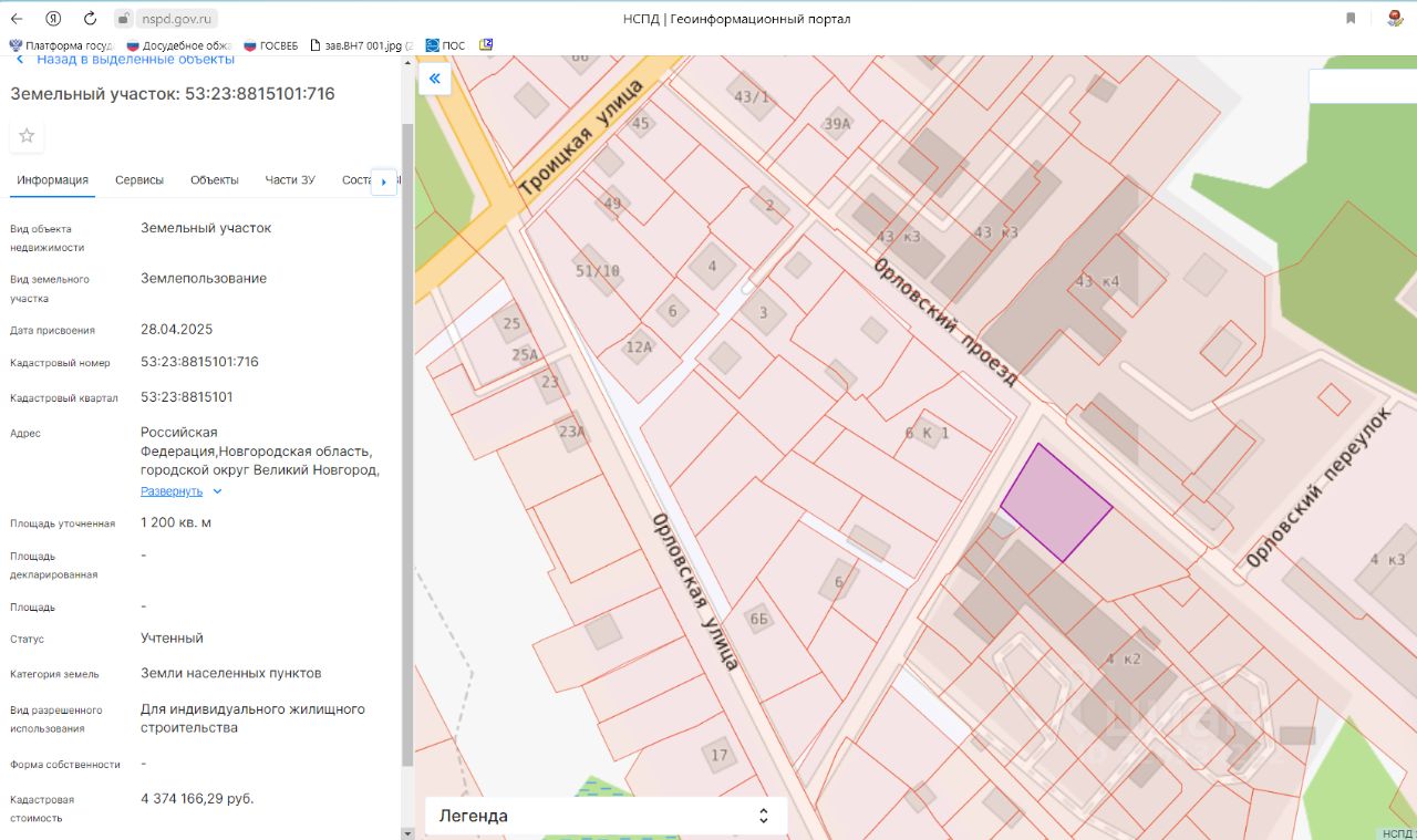 Земельный участок площадью 1200 кв. м с кадастровым номером 53:23:8815101:716, расположенного на землях населенных пунктов в территориальной зоне Ж.2 зона застройки малоэтажными жилыми домами, по адресу: Российская Федерация, Новгородская область, городской округ. Великий Новгород, город Великий Новгород, проезд Орловский, земельный участок 8, с видом разрешенного использования: для индивидуального жилищного строительства