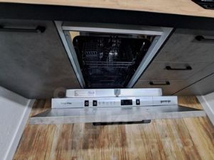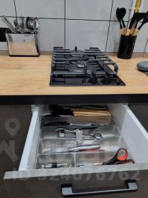 Кухня оснащена всей необходимой техникой: газовая плита с электророзжигом, встроенная микроволновая печь, электрический духовой шкаф, встроенный холодильник, посудомоечная машина, вытяжка. К тому же на кухне имеется вся необходимая посуда и утварь, чтобы готовить любые блюда.