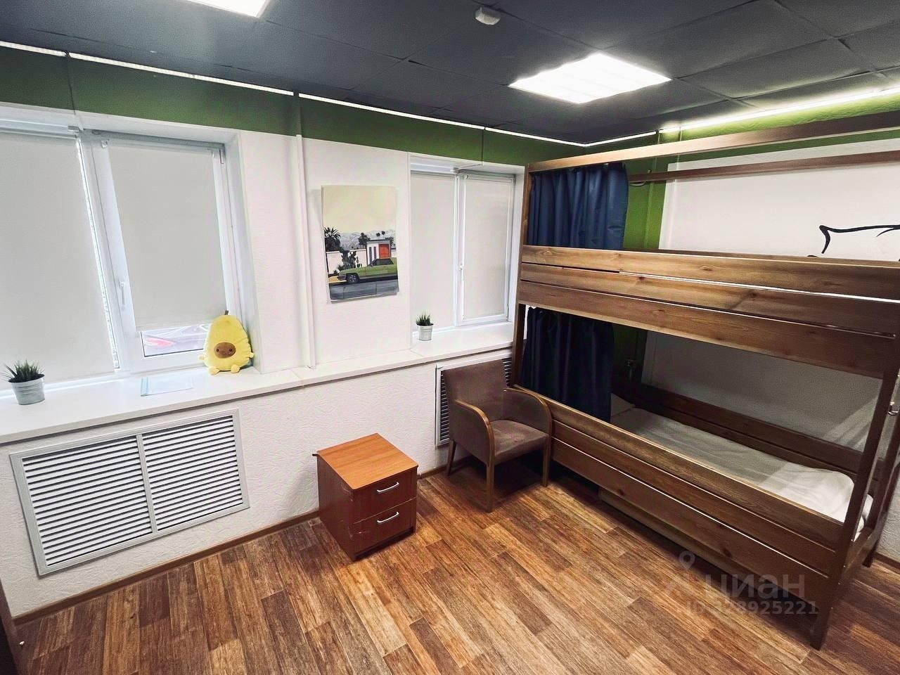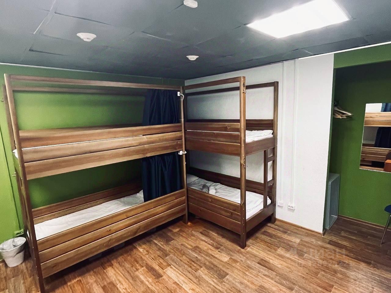 Общий номер для мужчин и женщин площадь 18 м2, на 6 мест, с двухъярусными кроватями, общим туалетом и ванной комнатой и телевизором.
