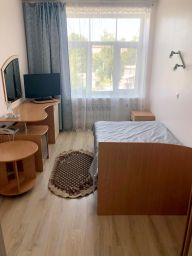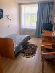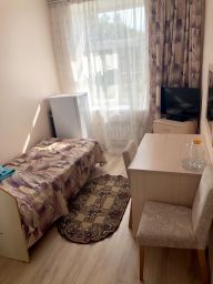 Блок одноместный состоит из двух раздельных номеров с общим санитарным узлом на два номера и прихожей.В номере: просторная кровать, прикроватная тумбочка, письменный стол , стулья, холодильник, телевизор, Wi-Fi , туалетная и душевая комната.
