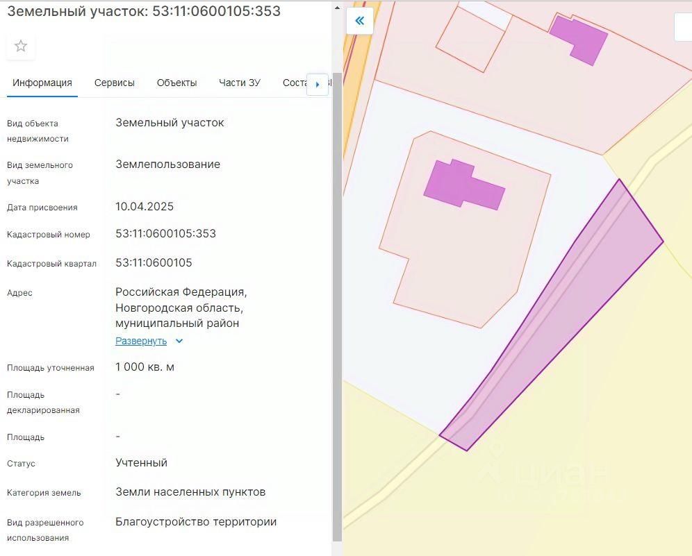 Лот 2 - земельный участок из земель населенных пунктов с кадастровым номером 53:11:0600105:353, площадью 1000 кв.м., расположенный по адресу: Новгородская область, Новгородский муниципальный район, Савинское сельское поселение, деревня Вылеги, земельный участок 1Д, разрешенное использование: Благоустройство территории