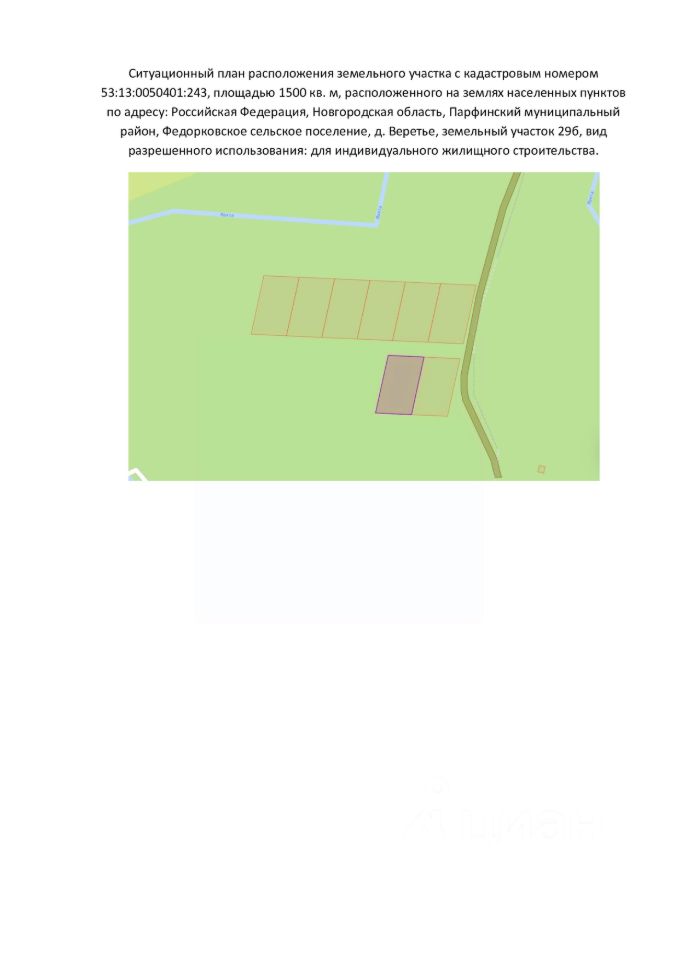 Земельный участок с кадастровым номером 53:13:0050401:243 площадь 1500 по адресу Российская Федерация,Новгородская область, муниципальный район Парфинский, сельское поселение Федорковское, деревня Веретье, земельный участок 29б