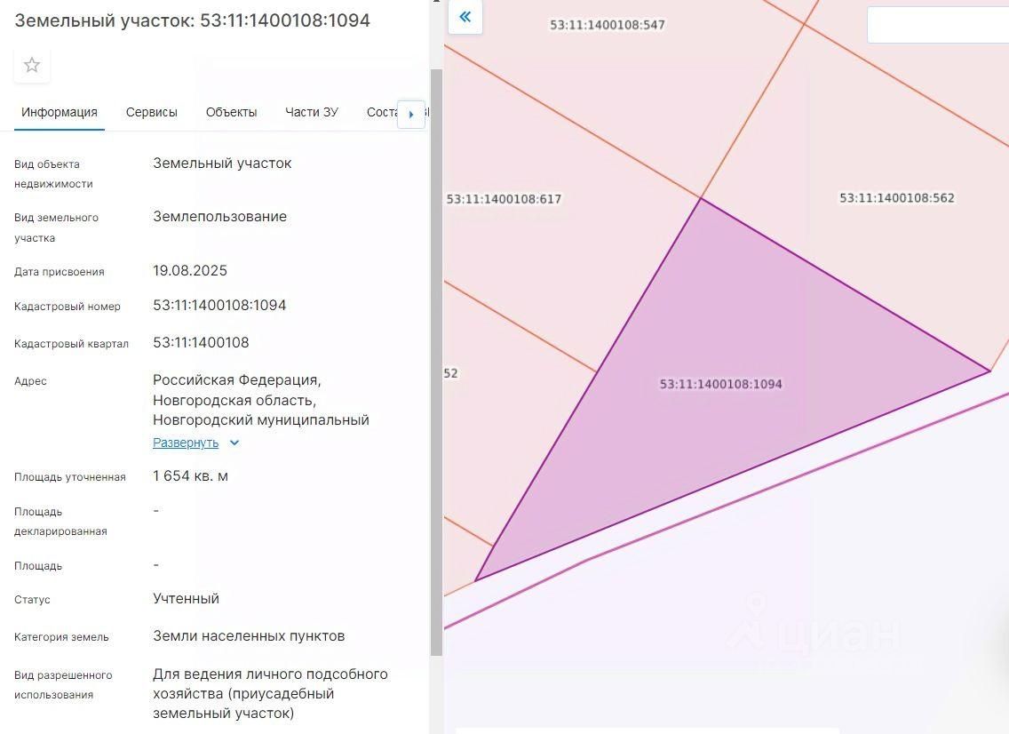 Лот 1 - земельный участок из земель населенных пунктов с кадастровым номером 53:11:1400108:1094, площадью 1654 кв.м., расположенный по адресу: Новгородский муниципальный район, Ракомское сельское поселение, деревня Новое Ракомо, улица Звёздная, земельный участок 11, разрешенное использование: Для ведения личного подсобного хозяйства (приусадебный земельный участок)