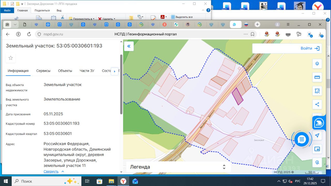 Земельный участок площадью 1404 кв.м., с кадастровым номером 53:05:0030601:193, по адресу: Российская Федерация, Новгородская область, Демянский муниципальный округ, деревня Заозерье, улица Дорожная, земельный участок 11, расположенный на землях населенных пунктов, из земель, находящихся в государственной собственности, в территориальной зоне Ж.5, с разрешенным использованием: для ведения личного подсобного хозяйства (приусадебный земельный участок)
