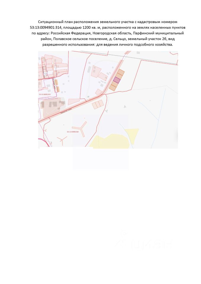 Земельный участок с кадастровым номером 53:13:0094901:314 площадь 1200 по адресу Российская Федерация, Новгородская область, муниципальный район Парфинский, сельское поселение Полавское, деревня Сельцо, земельный участок 2б