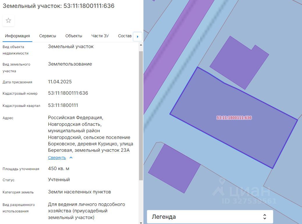 Земельный участок из земель населенных пунктов с кадастровым номером 53:11:1800111:636, площадью 450 кв.м., расположенный по адресу: Новгородская область, Новгородский муниципальный район, Борковское сельское поселение, д. Курицко, ул. Береговая, земельный участок 23А, разрешенное использование: для ведения личного подсобного хозяйства