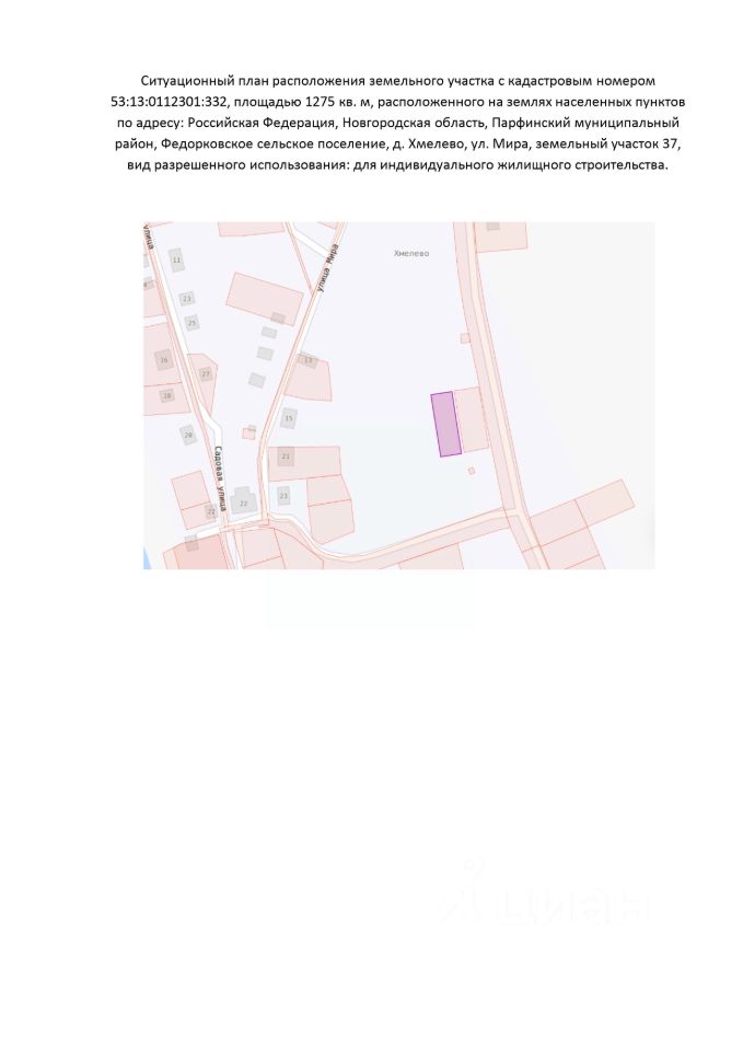 Земельный участок с кадастровым номером 53:13:0112301:332 площадь 1275 по адресу Российская Федерация, Новгородская область, муниципальный район Парфинский, сельское поселение Федорковское, деревня Хмелево, улица Мира, земельный участок 37