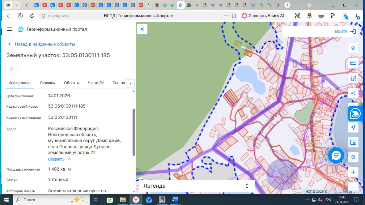 Земельный участок площадью1482 кв.м., с кадастровым номером 53:05:0130111:185, по адресу: Российская Федерация, Новгородская область, муниципальный округ Демянский, село Полново, улица Луговая, земельный участок 22, расположенный на землях населенных пунктов, из земель, находящихся в государственной собственности, в территориальной зоне Ж.5 - Иная зона жилой застройки, с видом разрешенного использования: для индивидуального жилищного строительства