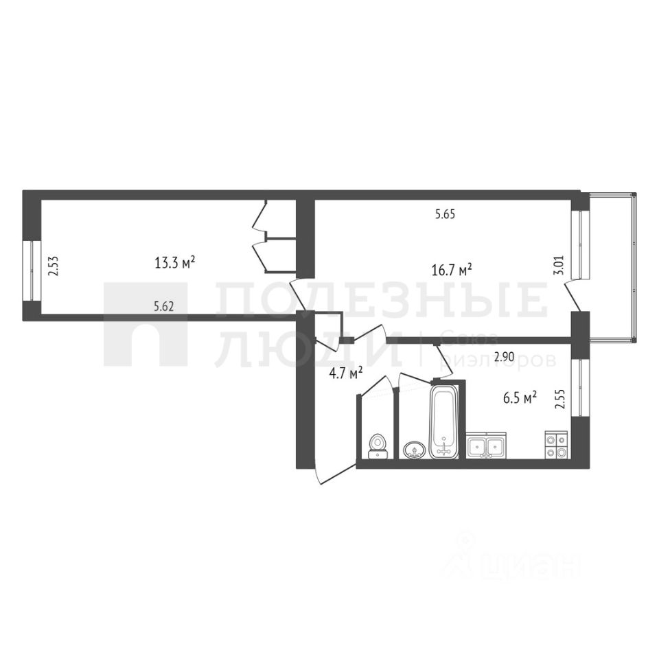 -Квартира состоит из двух комнат, проходной гостиной и спальной комнаты. •уютная спальня 13,3 кв.м •и проходная гостиная 16,7 кв.м с выходом на балкон.