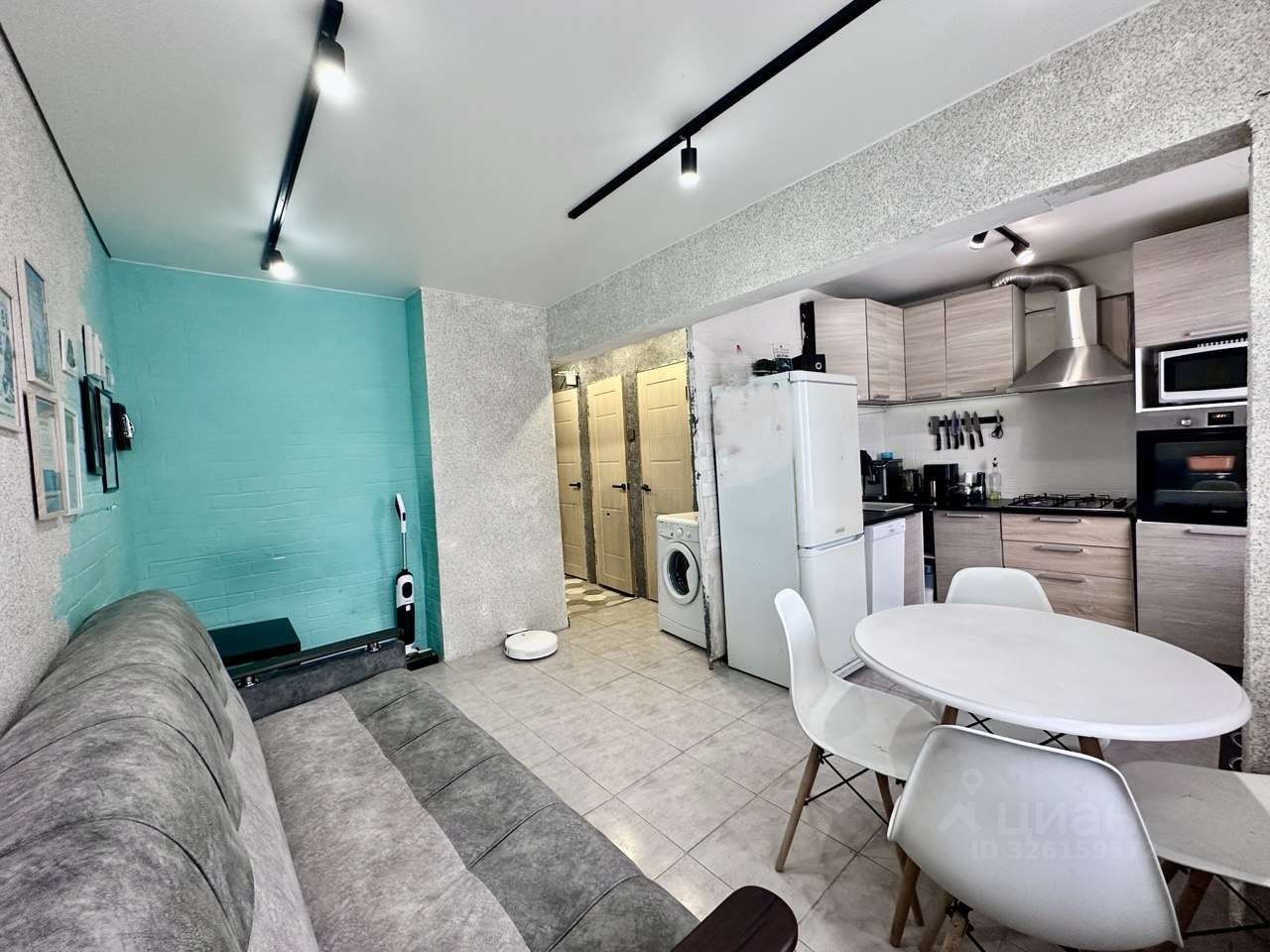 Полы: на кухне-гостиной — практичная плитка, в комнате — тёплый ламинат.