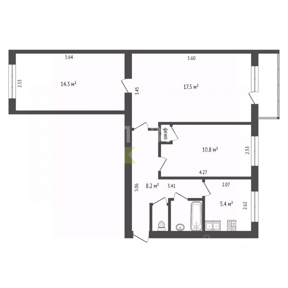 Справа расположен раздельный санузел, что актуально для большой семьи. В ванной комнате есть возможность установки как раковины, так и стиральной машины.