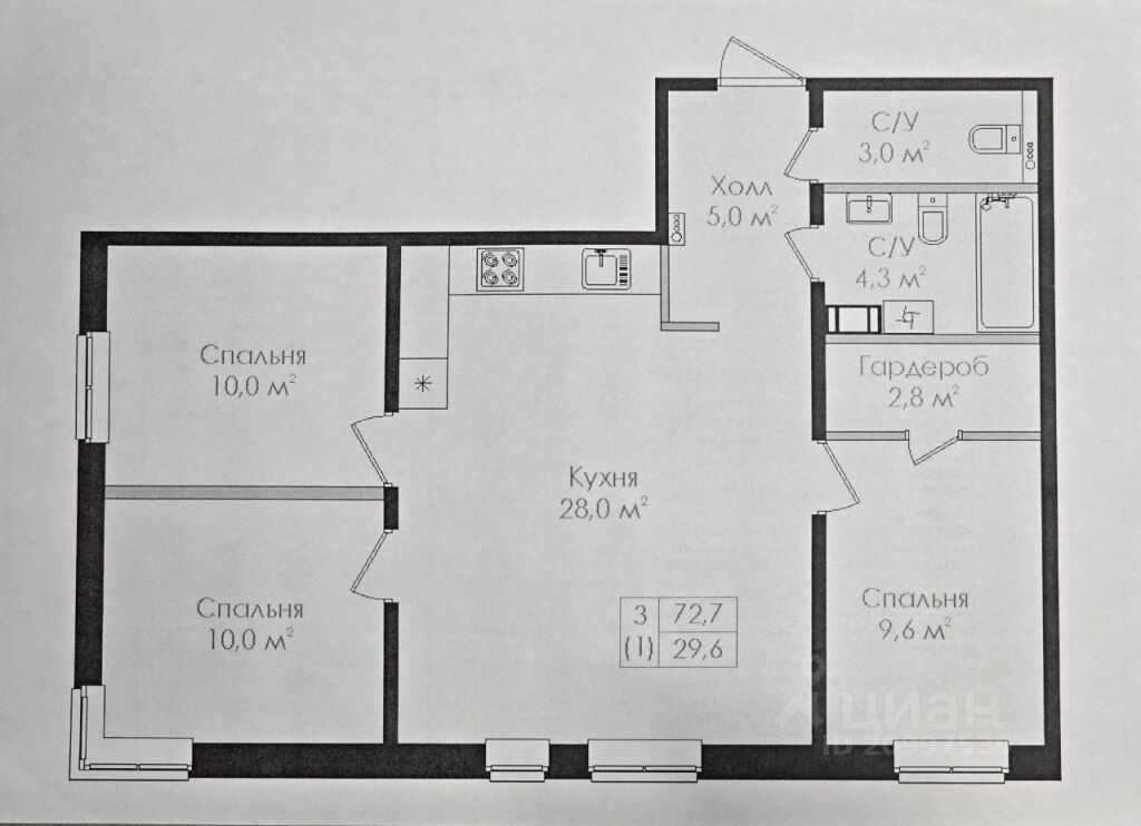 Oбщая плoщaдь - 73 кв. м.
