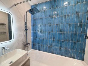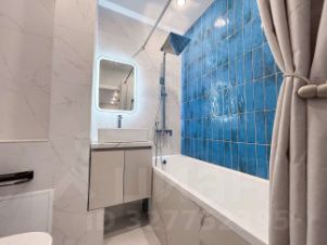 В ванной отделка кафелем, качественная сантехника, установлено большое зеркало с подсветкой, электрический полотенцесушитель.