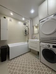 Покупателю остается встроенная корпусная мебель в кухне, включая встроенную технику (холодильник, посудомоечная машина, варочная поверхность, духовой шкаф, вытяжка), кондиционер, корпусная мебель в прихожей.