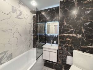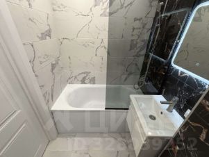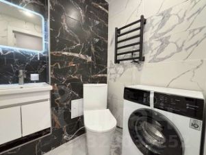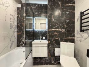 В ванной отделка кафелем, качественная сантехника, установлено зеркало с подсветкой, электрический полотенцесушитель.