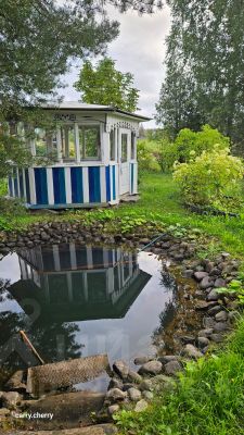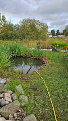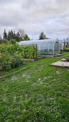На участке: баня 28,4 м² (с чердаком и дровяником), беседка с остеклением, навес для авто, два пруда, плодоносящий сад, огород, две теплицы, контейнер для хранения.