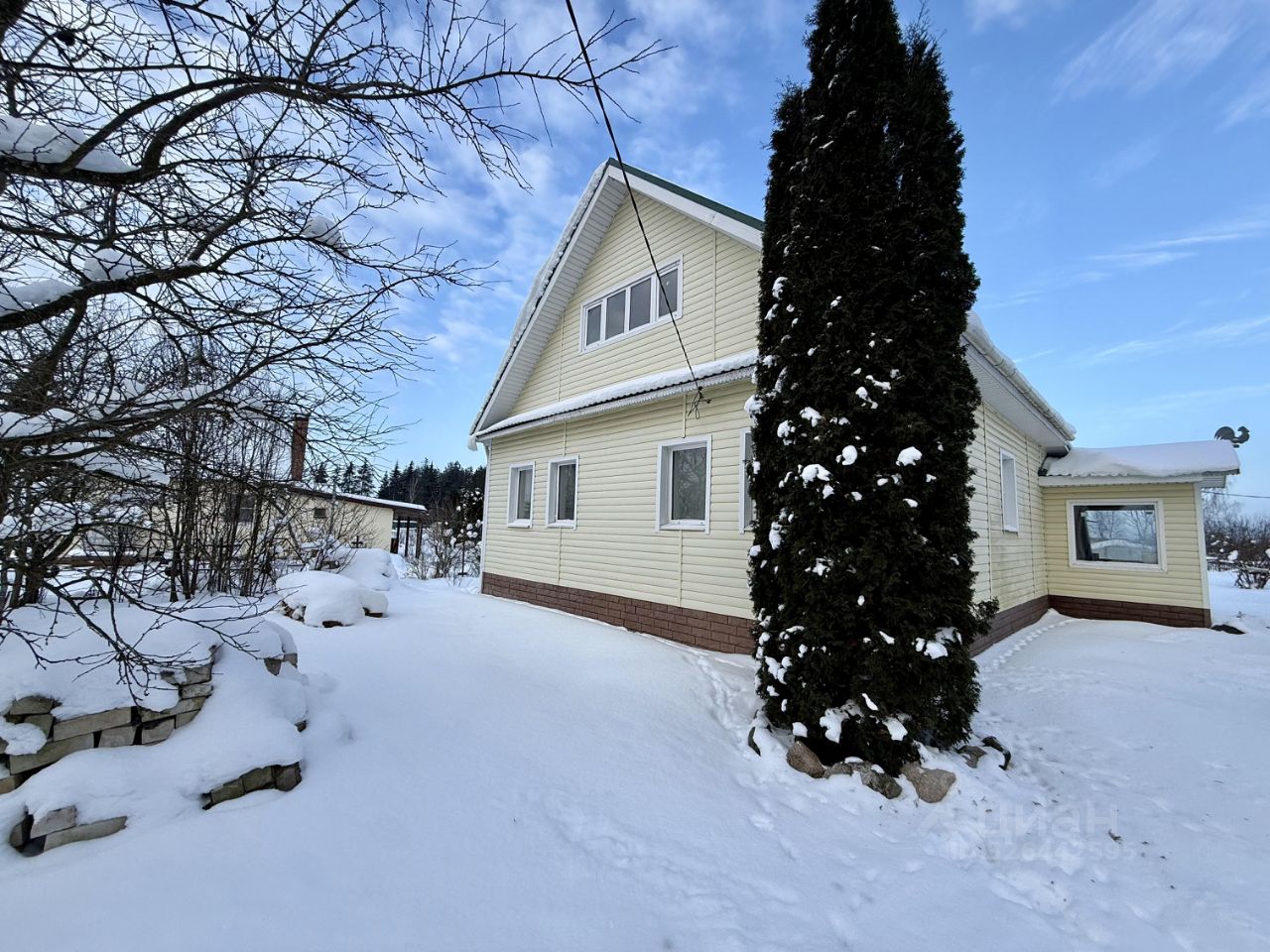 Дом бревенчатый, обшит сайдингом, расположен на ленточном фундаменте, имеется кессон и гараж. Построен в 1987 году. Водоснабжение центральное, 15 кВт, септик, газ- баллон, отопление- печное.