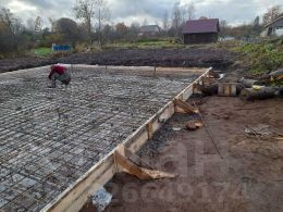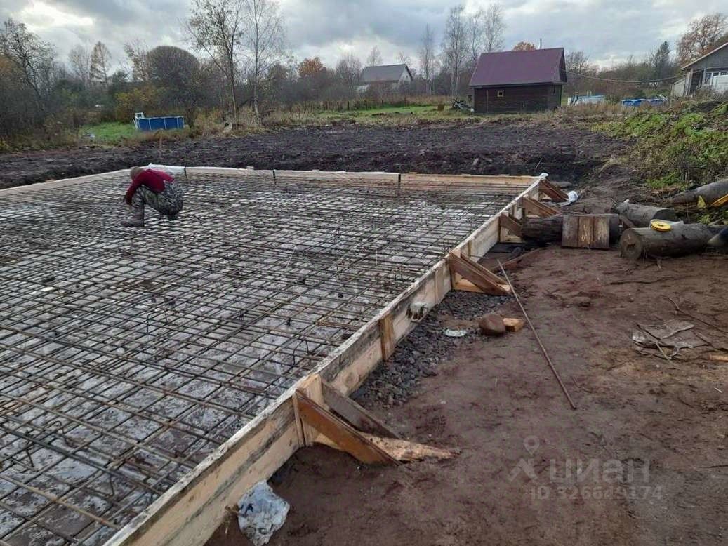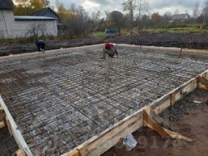 Участок полностью подготовлен: очищен, выровнен, отсыпан и огорожен со всех сторон. Подготовлена подушка под фундамент (плита 9x9) с связанной арматурой и опалубкой.