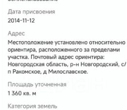 Продаётся земельныей участок Российская Федерация, Новгородская область, р-н Новгородский, Ракомское сельское поселение, д Милославское