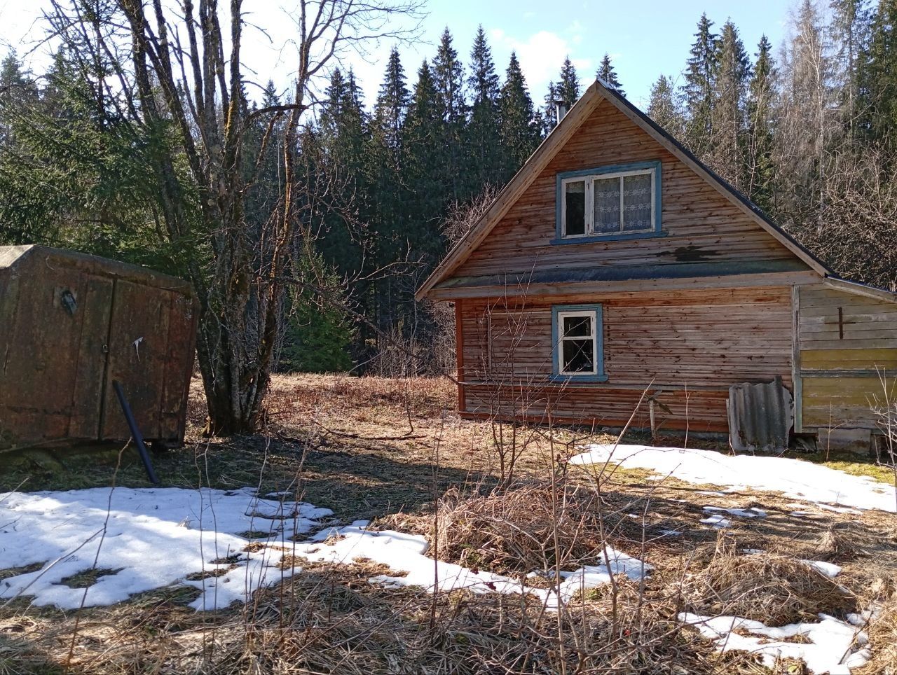 Крыша нигде не течёт. Требуется небольшой ремонт пола в зоне лестницы на второй этаж. В доме веранда, санузел, летняя кухня, просторная комната на первом этаже с каменной печкой, комната на втором этаже (отделка вагонкой).