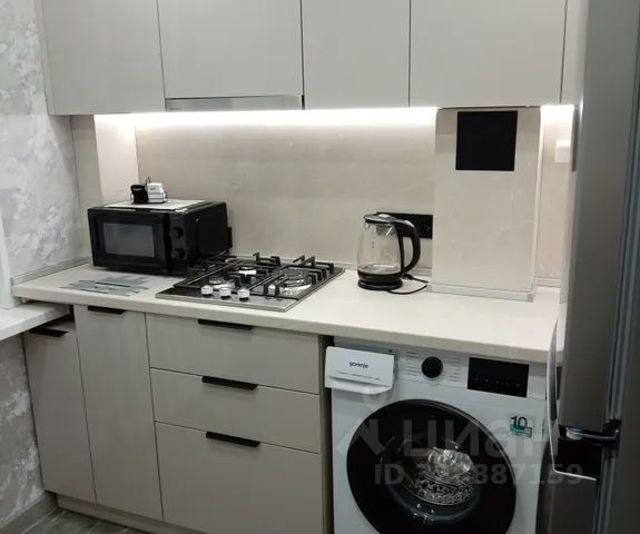 Оборудованная новая кухня с утварью для приготовления еды, новый холодильник, свч, газовая плита с духовкой;