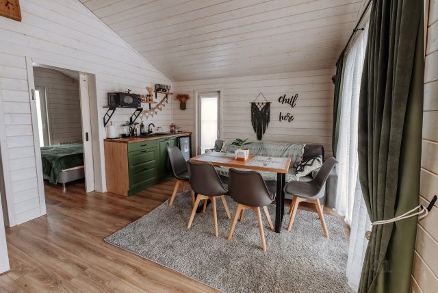 На 2 м этаже : 3 спальни с двумяспальными кроватями , ортопедическими матрасами. Постельное белье предоставляется. Сделан ремонт в стиле французский прованс и современная классика. В зале 35 м есть огромное место для танцев. Столы - книжки (3 шт.), 20 стульев позволят разместить своих гостей за праздничеым столом.